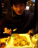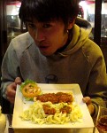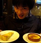 メニューは当然ながら全部フランス語でしかもオシャレどころか読みにくいだけど筆記体だったので困った。アントレ(前菜)+プラ・ドュ・ジュール(今日のおすすめ)+デサール(デザート)のコース14.50ユーロ(1ユーロはだいたい140円)とワインを注文。「旅行の醍醐味」とか言って何かわからないまま注文するTぼいと、もうちょっとでわかりそうだったのに急かされて結局適当に頼んでしまった僕。どっちにしても出てきた料理は最高、最初に出てきたワインからして安くて多くて美味!