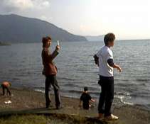 =景色に見入ったり写真を撮ったり石を拾ったりの図=